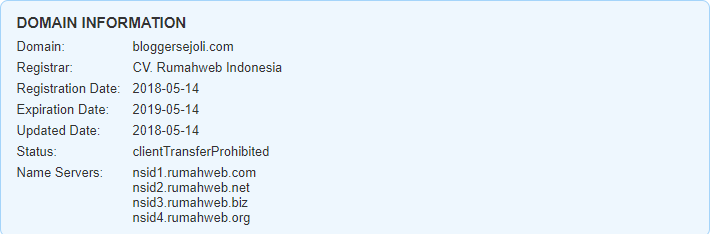 BloggerSejoli.com didaftarkan pada tanggal 14 bulan mei 2018 atau 6 hari yang lalu melalui registrar Rumah Web. Setelah diaktifkan, domain tersebut dikaitkan dengan blog ini pada esok harinya karena menunggu propagansi name server yang memakan waktu cukup lama. Setelah berhasil dikaitkan dengan blog, kemudian mode SSL dijadikan sebagai default dan semua trafik blog diredirect ke mode SSL.