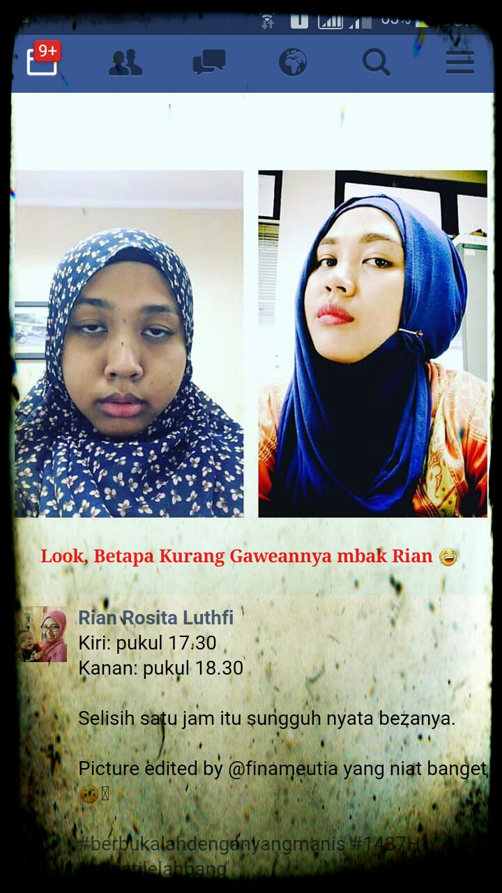 Kata orang-orang di kampung suami: Aku kudu misuh! Demi apah saat para wanita, ukhti-ukhti, mamah muda berlomba-lomba upload foto selfi paling cantik dengan berbagai gaya, mbak Rian malah meng-upload foto yang seharusnya menjadi aib yang harus disimpan rapat-rapat. LoL